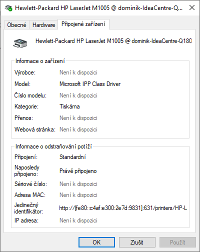 Na dalších obrázcích ukazuji další podrobnosti. Důležité je použití ovladače Microsoft IPP Class Driver. Takto připojené tiskárny tisknou.