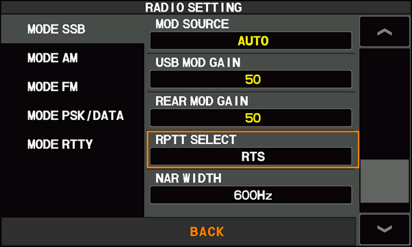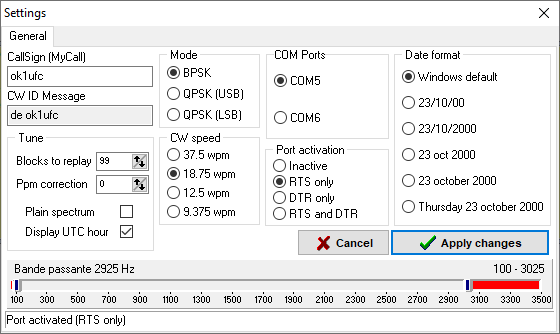 Program má hlavní lištu vlevo. Tam nastavíte úplně všechno, co se nastavit dá. Protože program nemá žádné ovládání pomocí CAT, musíme nastavit klíčování vysílače pomocí signálu RTS na sériovém portu. Aby to fungovalo, musí být stejný způsob klíčování nastaven na FT-710. To se dělá z menu - radio setting - RPTT SELECT: RTS, tak, jak je to viděl z obrázku vlevo dole. Stejně musíte nastavit program DXPSK -viz obrázek vpravo dole: FT-710 řídí port COM5 a je zaškrtnuto Port activation: RTS only.