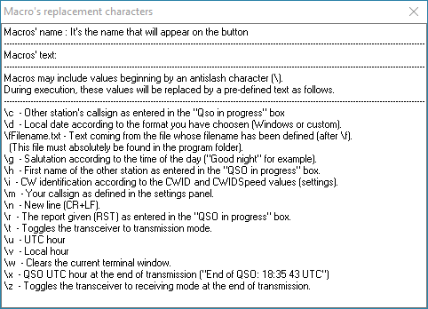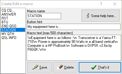 Program DXPSK je boží v tom, jak je jednoduchý. Nádherně editujete potřebná makra, viz obrázky dole. Průvodce vám vygeneruje ta základní, která ručně doeditujete ve vestavěném editoru. Význam příkazů a jejich syntaxe (písmeno za obráceným lomítkem) máte k dispozici ve vestavěné nápovědě. Prostě jednoduché a boží.