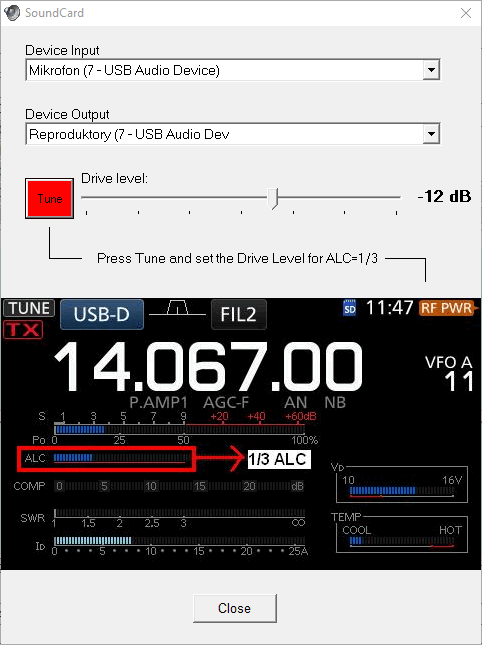 lze tlačítkem TUNE. TX se musí zaklíčovat a ALC ukazuje požadovanou