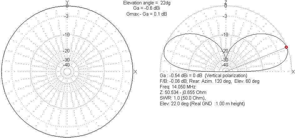 Všimněte si obou úzkých antén. Bylo u nich výše uvedeným postupem provedeno přizpůsobení na jmenovitém kmitočtu k vlnové impedanci napáječe Z=50 Ohmů. Šikmá montáž antény Neuvažujte o ní. Není to použitelné. Při sklonu 45° to vyzařuje např. takto: