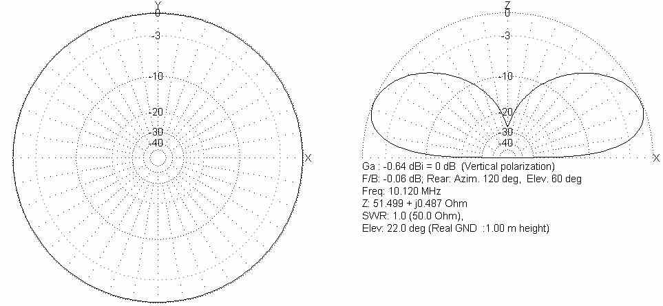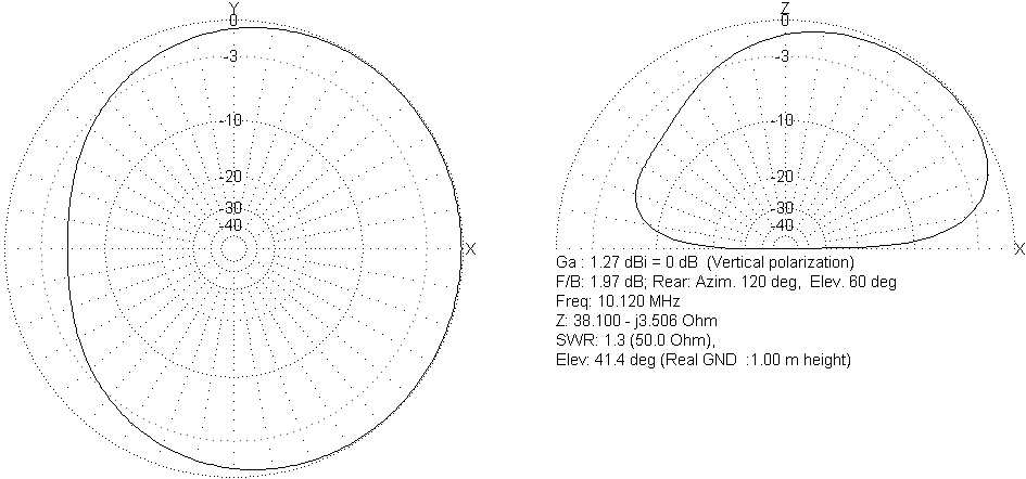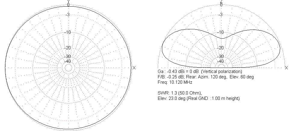 Charakteristika antény Jedná se o jednopásmovou zkrácenou anténu, která je vhodná k montáži v nízkých výškách nad zemí. Anténu lze snadno navrhnout tak, aby byla přizpůsobená k impedanci 50 Ohmů. Toho se docílí asymetrickou konstrukcí a asymetrickým napájením. Nepřerušenou částí zářiče protéká poměrně konstantní proud (proto dobře vyzařuje). Vyzařovací odpor však není 50 Ohmů, ale výrazně menší. Pozor na to při rozboru účinnosti. Ani místo přerušení není symetrické. Jeho polohou lze nastavovat nejlepší přizpůsobení ke koaxiálnímu napáječi. Lze snadno docílit hodnot VSWR = 1:1.1 (i lepších). Rezonance antény se nastavuje délkou vodičů. Nastavení je kritické a je důležité, aby bylo provedeno pro konkrétní výšku montáže antény. Mějme to na paměti a počítejme s tím, že spotřebujeme ve skutečnosti více drátu, než je na anténě použito. Doporučuji mít navíc jednu délku pro konstrukci přerušeného svislého vodiče. V okamžiku, kdy zjistíme potřebnou délku pro rezonanci, tj. dobrý analyzátor nám spolehlivě změřil, že jX=0, přistoupíme k nastavení nejlepšího VSWR, což znamená nalezení vhodného místa napájení . To, bohužel, musíme dělat tak, že např. z jednoho konce zářiče odstřiháváme a odstřižené ke druhému konci přidáváme, až je R=50 Ohmů. Uvědomme si, co tímto postupem vlastně děláme. Měníme polohu místa napájení při stejné délce zářiče. Vyzařování antény Anténa má nádherný vyzařovací diagram s nízkým vyzařovacím úhlem, typickým pro vertikály. Vyzařovací úhel je pro pásma od 40m nižší než u čtvrtvlnného vertikálu s radiály. Např. v pásmu 30m a 20m vypadá takhle nějak: 1. Vyzařování úzké antény (má výrazný pokles směrem vzhůru, vhodné pro DX):