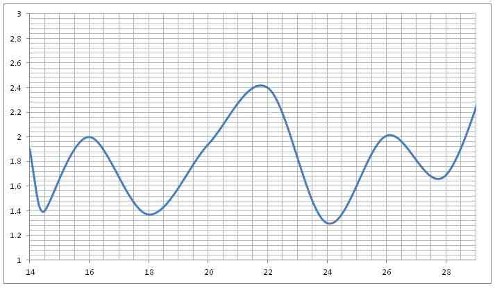 VSWR mezi VSWR=1.4 až VSWR=2.5, viz diagramy