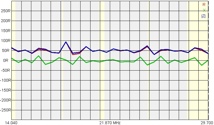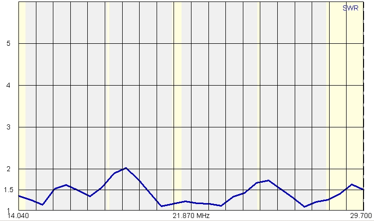 25.950 MHz, tedy mimo amatérská pásma a dostatečně vzdálené od nich. Průběh VSWR Typická (změřená) charakteristika VSWR vypadá takto, vidíte na ní špičky anomálních rezonancí:
