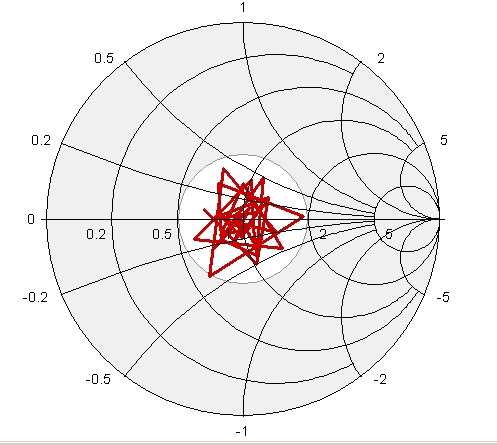 Smithův diagram (z ant. analyzátoru), kružnice VSWR je pro VSWR=2: