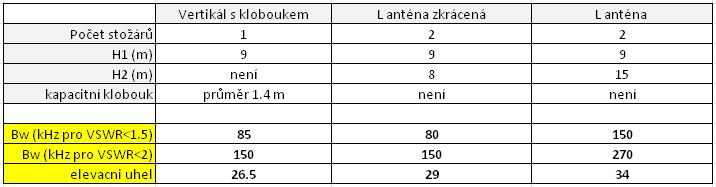Na obrázku vlevo je srovnání vyzařovacího diagramu L antény a vertikálu. Vpravo je vyzařovací diagram vertikálu. Srovnání všech tří antén Srovnání jsem jsem udělal do jednoduché tabulky. Srovnával jsem kromě geometrických parametrů vyzařovací úhel a šířku pásma všech tří antén: