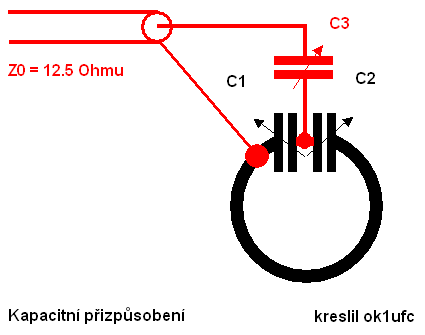 3. Takže nechávám na případných konstruktérech "obřích" MLA smyček, jak se poperou s metodou přizpůsobení. Mě funguje přibližně rovnocenným způsobem jak mohutný transformátor, tak kapacitní match s balunem 4:1 .... Ladění 3 kapacit se mi však zdá pracné.