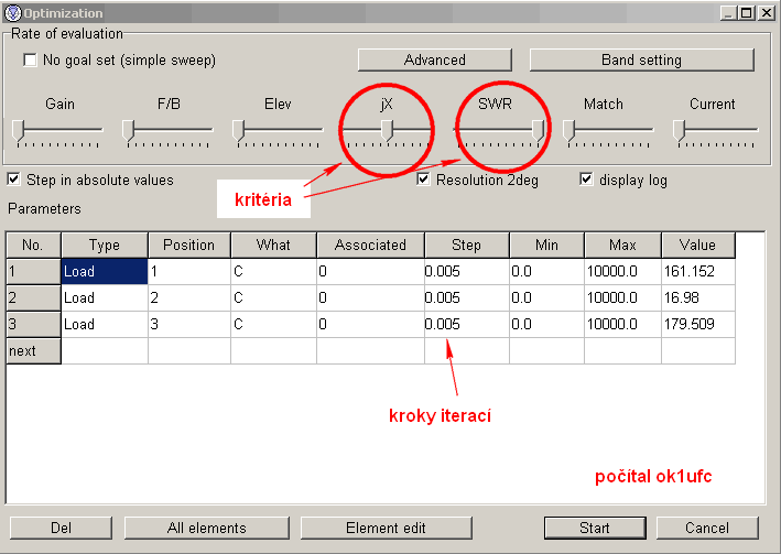 Kapacitu jsem se také pokoušel vypočítat optimalizátorem v MMANA. Překvapilo mě, že to šlo a konvergovalo a výsledek nebyl až tak daleko od pravdy. Nastavoval jsem toto: