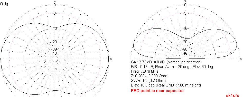 Poznámka: vertikální OCF dipól byl navržen jako přizpůsobený ekvivalent ke čtvrtvlnnému vertikálu se dvěma nadzemními radiály (GP s vodorovnými radiály ve výšce 2 metry). Anténa se dvěma nadzemními radiály je vhodná pro DX provoz. Je však velice důležité, aby oba radiály byly vzhledem k zemi symetrické, tj. aby se rušilo jejich vyzařování. V praxi se to často nepodaří a anténa má závažné chyby ve vyzařovacím diagramu. Anténa OCF dipól má zpravidla mnohem menší kapacitní klobouk a chyby ve směrovosti se projevují mnohem méně.