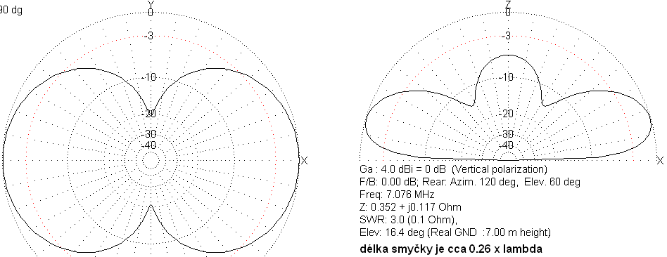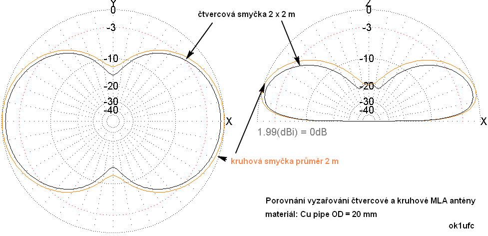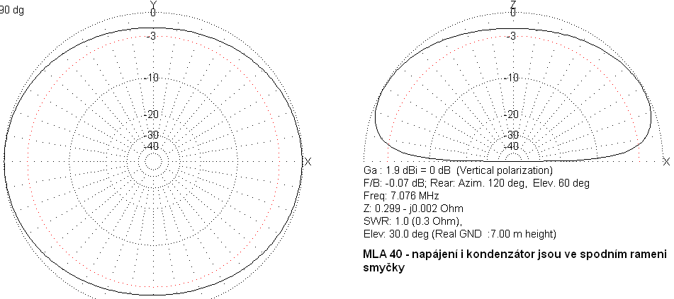 Další veličiny, které charakterizují tuto anténu, nejsou pro mojí konstrukci až tak podstatné, případně je uvedu v textu. Rovněž tak se nezabývám tvarem smyčky, protože závislost zisku na tvaru smyčky byla v literatuře dostatečně popsána a je známa. Pro ilustraci však uvádím srovnání vyzařování stejně konstruované smyčky s vakuovým kondenzátorem, z trubky o průměru 20 mm, materiál měď. V jednom případě má smyčka tvar kružnice, ve druhém případě obdélníku. Ve stejné výšce (7m spodní okraj) obě smyčky vyzařují obdobně, kruhová smyčka má asi o 0.5 dB vyšší zisk: