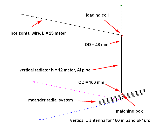 Ano, musím připustit, že poté, co jsem se pustil do výroby modelu pro pásmo 40 metrů a do úvah a výpočtů v pásmu 160 metrů, jsem skeptický. Od jara, kdy jsem se pustil do srovnání několika drátovek a hrál jsem si s vlajkovými stožárky o výšce 12m, zkonstruoval jsem vertikální L anténu pro pásmo 160 metrů. Na vertikálech pro 80 m a 40 m jsem ověřil vlastnosti a navrhování meandrových nadzemních radiálů. Lze s nimi snadno vykompenzovat různé nesymetrie vůči zemi. A tak vznikla hezky přizpůsobená, 12 metrů vysoká L anténa pro pásmo 160 metrů s teoretickým ziskem cca 1.5  dBi: