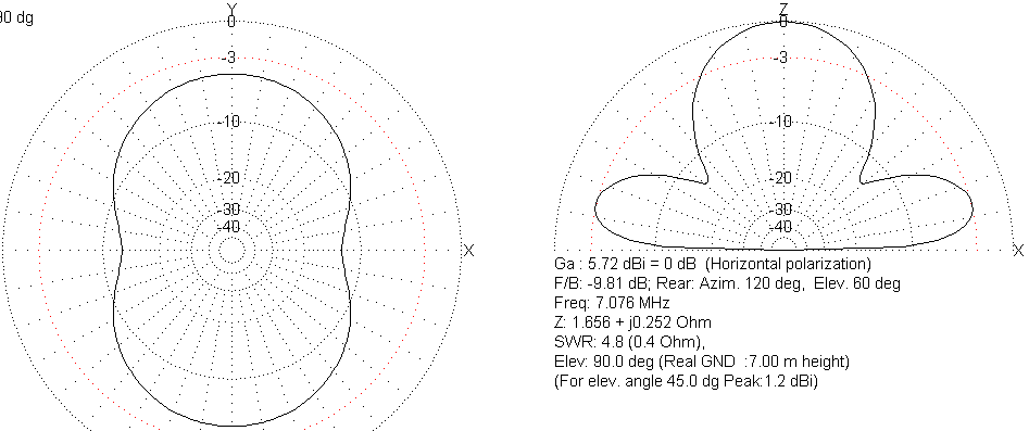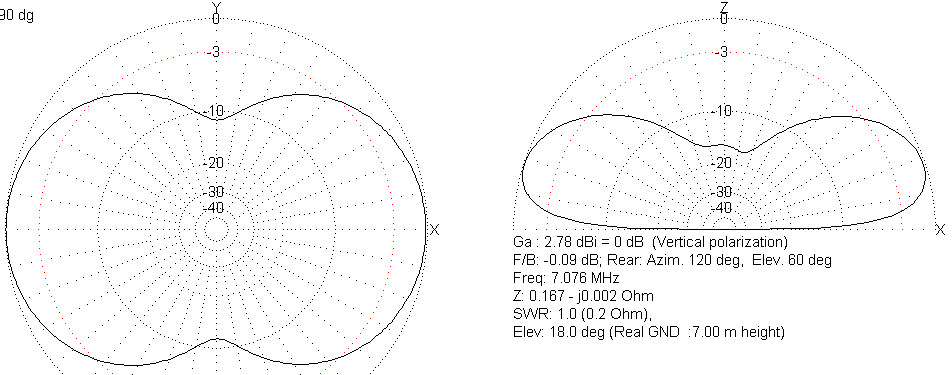 Supravodivá čtvercová smyčka uvedených rozměrů bude mít vyzařovací odpor R=0.1103 Ohmu a zisk Gi = 4.19 dB. Pokud ji budu instalovat do výšky h=7 m, bude potřebovat pro rezonanci kondenzátor C=58.45 pF a bude vyzařovat nejvíce v elevačním úhlu 17.8°. Takže to bychom brali, že? Vyzařovací diagram vypadá takto: