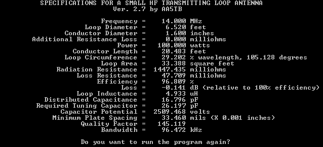 je uveden excelovský sheet a jednoduchý kalkulátor. Přestože jsem na svých stránkách uvedl metodu návrhu odlišnou, a to z důvodu, že jsem se chtěl pokusit najít nejjednodušší metodu, pomocí které by bylo možné alespoň orientačně stanovit vyzařování MLA, je moje metoda návrhu přece jen složitější, než použití jednoduchého kalkulátoru. Zajímavé je porovnat výsledky. Zatímco vypočtené účinnosti budeme pravděpodobně muset věřit, můžeme si provést srovnání vypočtených hodnot ladicích kondenzátorů smyčky. Podrobněji jsem zkoumal realitu a vypočtené hodnoty u dvoumetrové smyčky z tlusté měděné roury, kterou se mi podařilo sehnat. Schéma a výpočty pomocí AA5TB jsou zde: