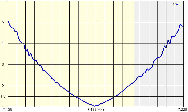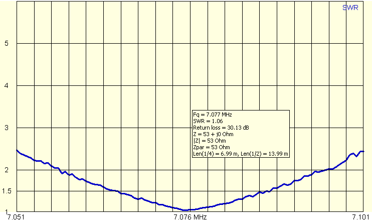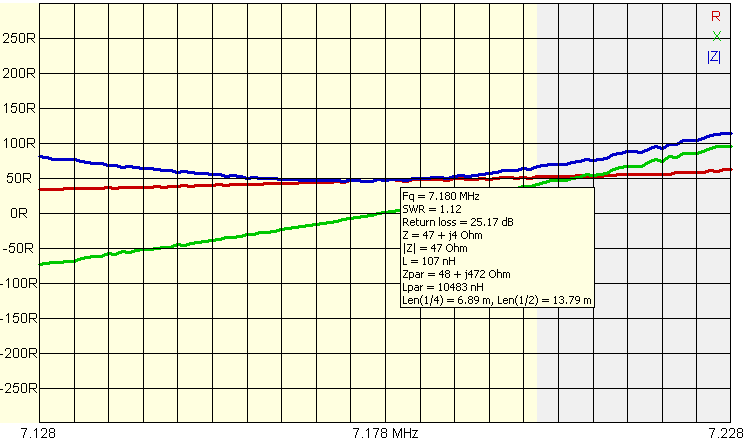 S transformátorem lze snadno realizovat dobré přizpůsobení i pro přenos značných výkonů. Šířky pásma, průběhy impedancí a průběhy VSWR jsou na následujících diagramech, měřeno na rezonanci 7.177 kHz (40m). Šířka pásma s kabelem RG-58 (Nordix) byla pro VSWR = 2 asi 50 kHz: