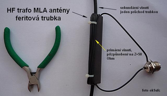 Provedení transformátoru - proti kondenzátoru je napájecí transformátor. Koaxiál prochází trubkou, je pouze prostrčen. Primární vinutí je realizováno z vodiče s PE izolací a transformační poměr je navržen tak, aby byla nízká impedance smyčky přizpůsobena k napáječi Z=50 Ohm. Jádro je trubka z jakostního HF feritu s poměrnou permeabilitou cca u = 100. Je třeba si uvědomit, že feritový materiál transformátoru ovlivňuje rezonanční kmitočet smyčky.