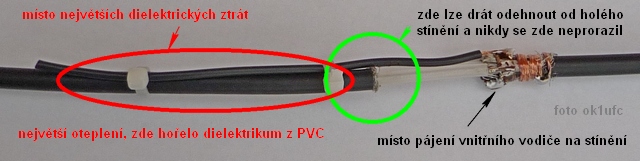 Poznámka 3: V textu jsem psal o tom, jak jsem při zkracování koaxiálu velice snadno přejel rezonanční kmitočet smyčky. Když jsem se pokusil smyčku doladit kouskem drátku - viz foto, který tvořil kapacitu proti plášti, šlo to, samozřejmě. Při výkonu kolem 50 Wattů se však dielektrikum, tj. izolace drátu a pláště koaxiálu, zjevně ohřívala a při 100 Wattech jsem po pár sekundách zaregistroval "kouřové signály". Opět platí to, co jsem napsal v textu o pár odstavců výše, že dielektrikum kondenzátoru je pro MLA smyčku důležité z hlediska účinnosti a ztrát. I tak nepatrné množství PVC, jako bylo použito na mém kondenzátoru (asi 8 cm izolace na drátu a koaxiálu) stačí k tomu, aby se experimentální anténa stala nepoužitelnou. Pokud tato kapacita na smyčce nebyla, byl jsem schopen pracovat s touto anténou z RG-58 a výkonem 60 Wattů (maximum, které při JT65 používám) nepřetržitými cykly RX/TX.