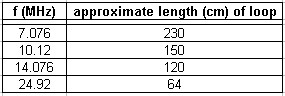 Vyzkoušel jsem smyčky z RG-58 vyrobit pro několik kmitočtů. Potřebnou délku velice silně ovlivňuje použité feritové jádro. Dostříhání délky je velice kritické, snižujeme současně indukčnost i kapacitu, proto je to tak strmé. Moje smyčky měly tyto přibližné délky: