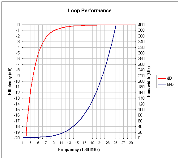 Mohu potvrdit, že pomocí obou metod byly stanovené přibližně stejné hodnoty ladicího kondenzátoru, které odpovídaly skutečnosti a rovněž vypočtené účinnosti si odpovídají. AA5TB počítá účinnost smyček také ve spredsheetu, kde její průběh zobrazuje graficky, v závislosti na kmitočtu - viz převzatý příklad: