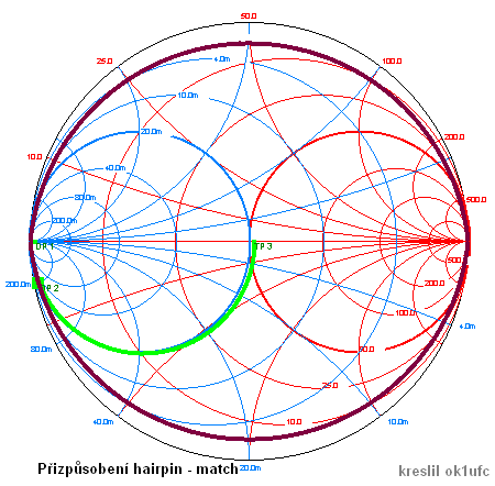 Důvody mám dva. První důvod spočívá v tom, že většina moderních HF zařízení je konstruována s moderními feritovými transformátory. Včetně výkonových zesilovačů pro stovky wattů. Proč bych tedy neměl mít jakostní a širokopásmový HF transformátor na své MLA anténě?  Druhý důvod spočívá v tom, že jsem si vždycky zvykl odhadovat či počítat ztráty na anténě a jejím napáječi. Následují dva obrázky. Na prvním je přizpůsobení HF trafem. Na druhém je přizpůsobení pomocí hairpin match. Je využita pouze indukčnost. Požadovaná kapacita obvodu je realizována nepatrným rozladěním smyčky antény. Do druhého diagramu je zakreslena křivka Q = 10. Všimněte si, že ani tato křivka nám "neschová" kružnice elementů hairpin matche. U MLA antény musíme se ztrátami šetřit. Je jich tam dost, které vyplývají z maličkého vyzařovacího odporu a velkého ztrátového odporu. Tak proč si přidělávat další? Vždyť přeci chceme na tu anténu vysílat a dělat DXy. Nebo nikoliv? Obdobný závěr lze udělat také k jinému typu přizpůsobení reaktančním čtyřpólem. U čtyřpólu prostě a jednoduše zapomeňte na nízké Q zatíženého obvodu, které je pro nízké ztráty nutné!