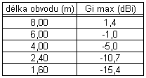 Pro úplnost zde doplním informace o závislosti zisku smyčky na délce jejího obvodu. Porovnány jsou na kmitočtu 7.050 MHz čtvercové smyčky vyrobené vždy z měděné trubky o vnějším průměru 20 mm, laděné vakuovým kondenzátorem. Spodní okraj je vždy ve výšce 7m: