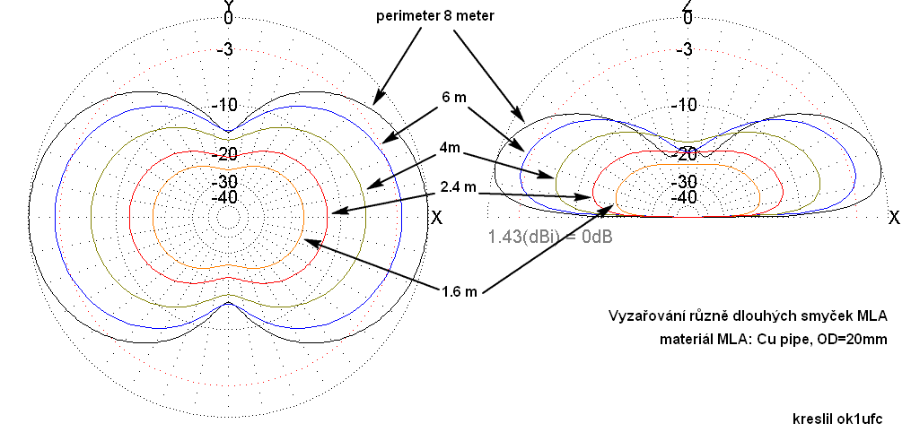 Vyzařovací diagramy smyček o obvodu 8m, 6m, 4m, 2.4m a 1.6m vypadají takto: