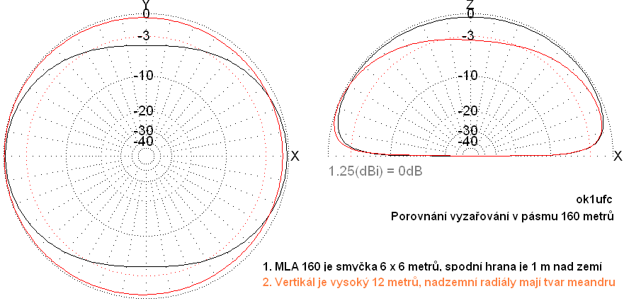 U MLA antény pro 160 metrů se již na charakteristice projevuje její malá výška nad zemí. U vertikální L antény si všimněte vlivu 25 metrové horizontální části, která způsobuje vyzařování vzhůru. Pro NVIS komunikaci to zde nezatracuji, ani se nesnažím konstruovat symetrický klobouk, abych toto záření poptlačil. 12 metrů vysoký zářič je nahoře zatížen indukčností a horizontálním vodičem, který zatěžuje kapacitně a také vyzařuje. Směrem k horizontu však obě antény vyzařují stejně.