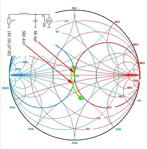 3. Řešil jsem přizpůsobení ve Smith diagramu, jen pro 14.2 MHz, na