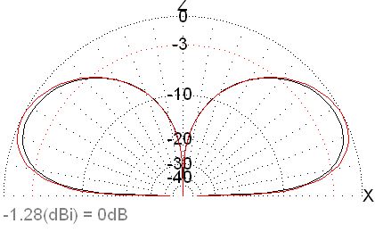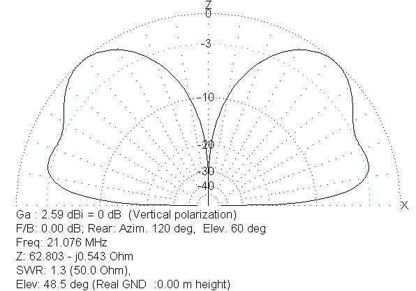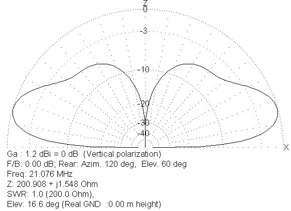 Na obrázku vpravo (č.4) je pětiosminový zářič přizpůsoben k impedanci napáječe Z=50 Ohm bez transformačního balunu. Všimněte si vyzařování horního laloku. Již není jeho maximum potlačeno o 3 a více dB, jako v předchozích případech. Zářič je již delší než 5/8 lambda. Překročíme-li tuto hodnotu. Anténa nebude pro DX použitelná! Toto je zásadní úskalí konstrukce antény s délkou kolem 5/8 lambda. Mimo kompenzační indukčnosti v patě vertikálu musíme řešit vhodnou transformaci reálné složky impedance. Např. balunem nebo tunerem. Nebezpečí spočívá v tom, že snadno překročíme délku zářiče o několik cm, indukčností vyladíme rezonanci a výsledek je zřejmý z tohoto obrázku č. 5: