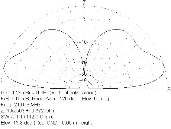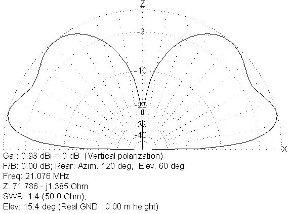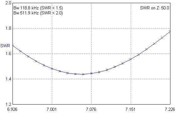 Uvádím modelovanou charakteristiku pro pásmo 15 metrů. Vizuální rozdíly v charakteristikách jsou malé. Zisk v maximu vyzařování se liší jen o 1.3 dB. Vypočtené elevační úhly se však liší na všech pásmech od 40m do 6 metrů o 1° proti čtvrtvlnné anténě. Přizpůsobení Při experimentech jsem antény neladil na VSWR = 1. Při zemním systému v mém QTH mi, bohužel, pracují s dobrým VSWR čtvrtvlnné vertikály. Vyšší optimalizované vertikály mají v mém QTH minimum VSWR na hodnotách kolem 1.4 až 1.5 a doladění na VSWR = 1 je již mimo optimální vyzařovací úhel. Já jsem ladil délky zářičů na požadovanou hodnotu jX (bez kondenzátoru je nenulová) a kapacitní dekádou jsem "nacvakal" jX=0. VSWR potom vyšlo tak, jak vyšlo .... Průběh VSWR na pásmu 40 m uvádím pro informaci zde: