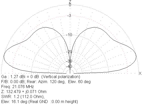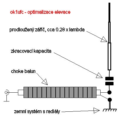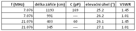 napíšu, co mě konkrétně zaujalo. Když jsem psal svůj druhý článek, uvedl jsem v něm charakteristiku zisku a vyzařovacího úhlu v závislosti na délce vlny. Z výsledků je zřejmé, že při nepatrném zvyšování výšky nad jednu čtvrtinu lambda a při současné kompenzaci jalové složky kondenzátorem v sérii, nám klesá vyzařovací úhel. Tato závislost má své optimum. Lze ho modelovat v NEC programech. Postupujeme tak, že nastavíme dvě kritéria. Prvním je optimalizace na nízký vyzařovací úhel, druhým je kompenzace jalové složky na jX=0 (nebo přizpůsobení na VSWR). A proměnnými jsou délka zářiče a velikost kapacity. Způsob napájení a hodnoty prvků, které použil OM3CA jsou hodnotami optimalizovanými. Měl jsem možnost porovnat délky zářičů a velikost kapacity se svým experimentem na dvou kmitočtech, ale o tom píšu dále. Schéma takto optimalizované antény