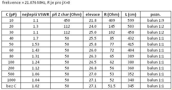 paralelními zářiči. Další možnosti nastavení V předchozím textu jsem napsal, že anténa je optimalizovaná z hlediska vyzařovacího úhlu. Je to skutečně pravda? V diagramu v článku 2 o vertikálech je vidět, že zisk se zvětšující se délkou zářiče dále roste a elevační úhel klesá až k délce 0.625 x lambda. To je skutečnost. Při dalším prodlužování zářiče již převáží vyzařování horním lalokem a veškerá energie půjde do nebe. Uvádím zde na správnou míru, co bylo myšleno optimalizací čtvrtvlnné antény. Optimalizací byla myšlena konstrukce, kterou lze při transformačním poměru balunu 1:1 přizpůsobit s dobrým VSWR k napáječi s vlnovou impedancí 50 Ohmů. Nebo 75 Ohmů, na takové impedanci je vyzařovací úhel ještě příznivější. Anténu podle OM3CA však můžeme nastavit v mnoha pásmech (mimo 40m, tam bude zářič krátký) na hodnoty mnohem vyšší, než je 0.28 x lambda. Abychom vyšší impedanci přizpůsobili, musíme použít balun s transformačním poměrem vyšším, než 1:1. Takké můžeme do paty vertikálu instalovat dálkově ovládaný automatický tuner, kterým budeme ladit anténu do rezonance. Těmito metodami lze docílit dalšího snížení vyzařovacího úhlu. Uvádím tabulku pro kmitočet 21.076 MHz, ze které je zřejmá délka zářiče, hodnota kondenzátoru a hodnota reálné složky impedance při rezonanci: