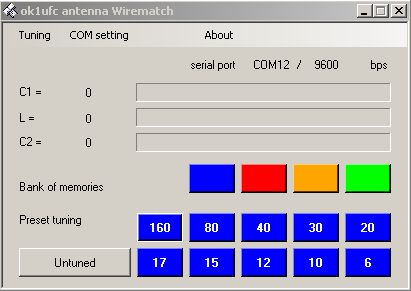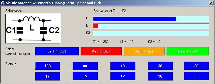 Filosofie ovládání je taková, že v okně vpravo se ladí požadované hodnoty a ukládají do pamětí (4 banky pro každé pásmo). V okně vlevo se jen vybírají hodnoty z pamětí. Potřebné hodnoty LC nám "nacvakají" relátka. Jeden posuvník předělám pro ovládání délky zářiče.... |