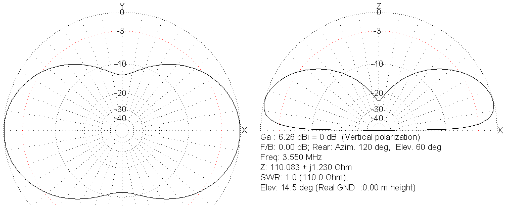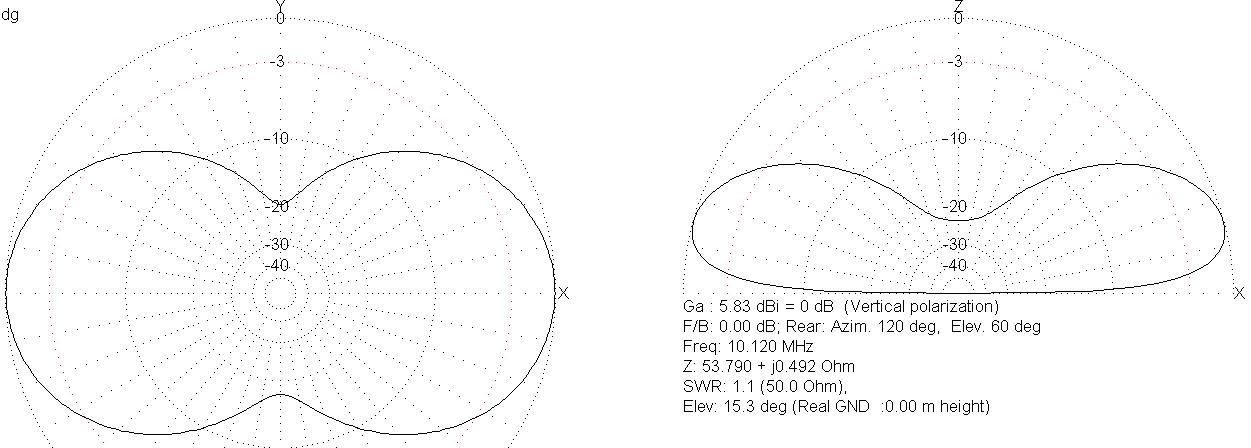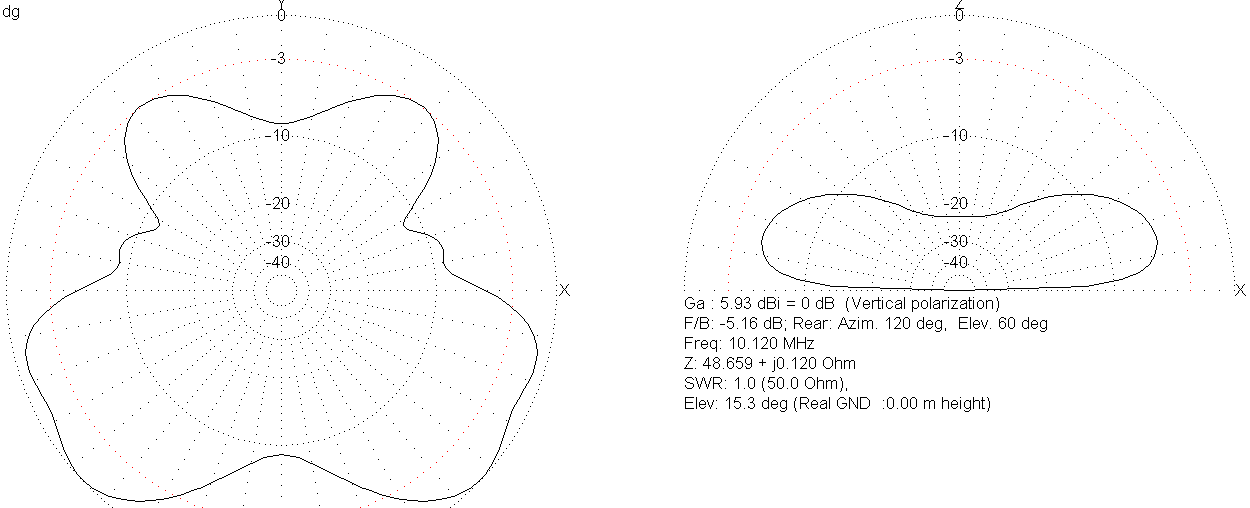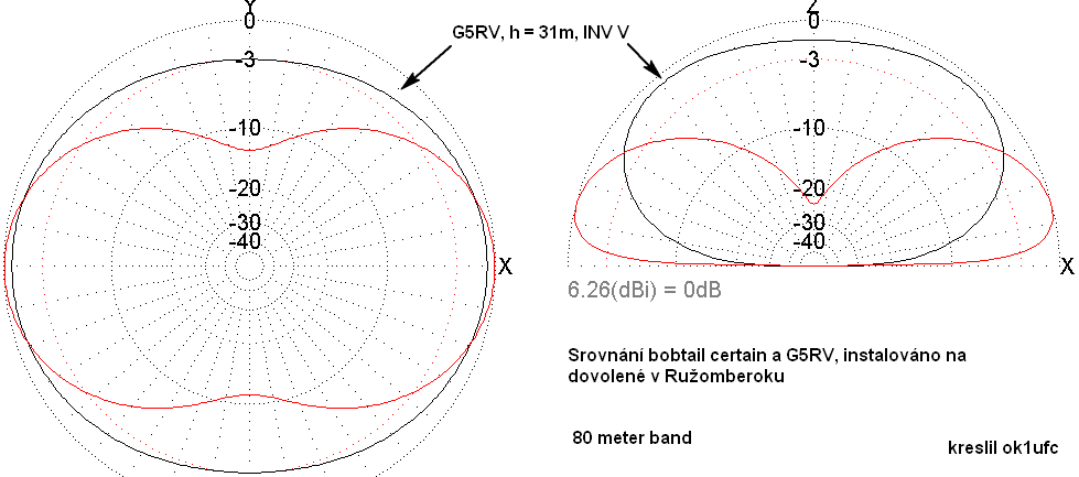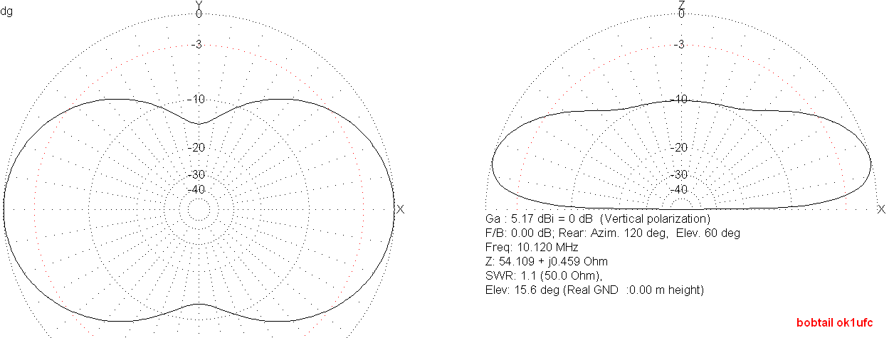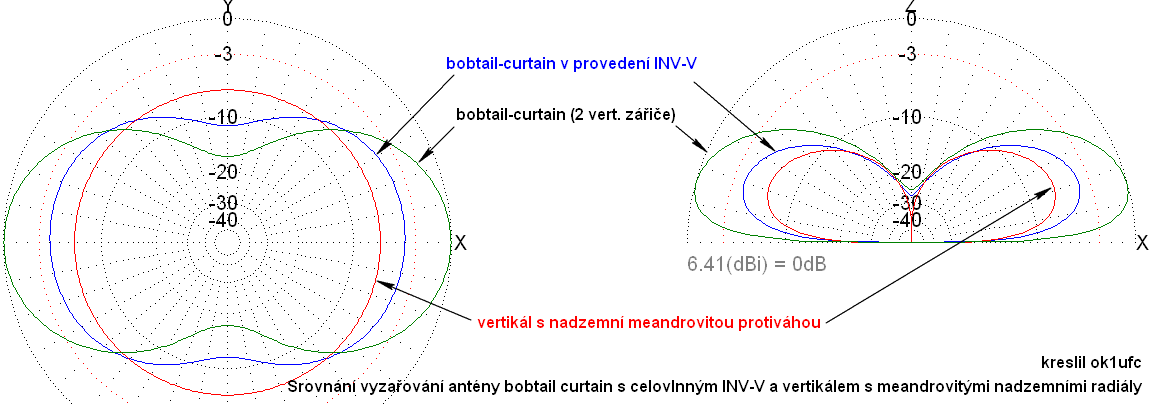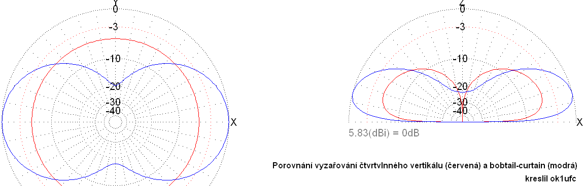 Když vertikál nestačí, lze si pomocí zvýšením zisku do požadovaného směru realizací jednoduché, nízké, snadno přizpůsobitelné (VSWR jsem měl vždy 1:1), ziskové bobtail-curtain antény. Porovnání vyzařování obou antén uvádím v posledním diagramu: