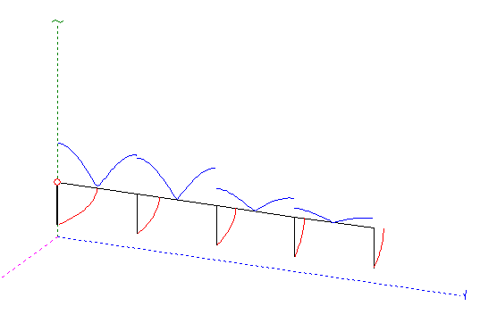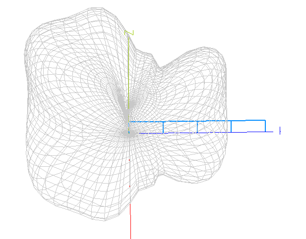 Omlouvám se, pokud se tato anténa již nejmenuje bobtail curtain, ale nějak jinak. Nicméně, nevím jak, tak hluboké encyklopedické znalosti nemám, ale princip antény je stejný. Konstrukčně se anténa liší. V závěsném bodě nahoře je vysoká impedance. Zářiče nejsou svislé, ale šikmé. Od balunu jsem šel koaxiálem rovnou do rádia IC 706 Mk2, do 2 patra, přízemí a technické podlaží bylo vyšší, výška mohla být tak 12 m. Koaxiál byl mírně šikmo. Tuner nebyl  třeba. Vyzařování uvedené antény by mělo vypadat nějak takto:
