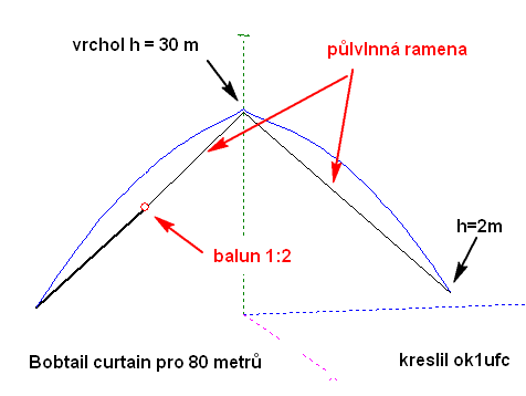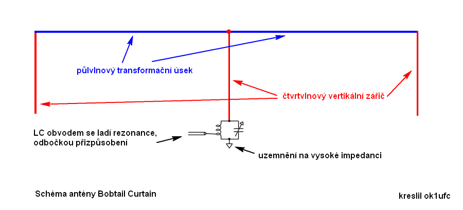 Anténa bobtail-curtain patří mezi vynikající vertikální antény. Její základní schéma je na tomto obrázku a namaloval jsem ho tak, jak jsem ho před mnoha léty, když ještě nebyl Internet, převzal z literatury, jejíž zdroj nejsem schopen uvést: