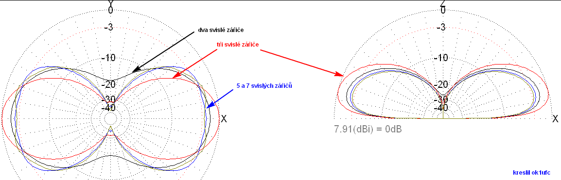 Zde uvádím pro pochopení vlivu svislých prvků u antény bobtail-curtain ještě vyzařování antény se třemi, pěti a sedmi prvky. Vždy je napájen prostřední prvek a diagram je srovnáván s dvouprvkouvou anténou: