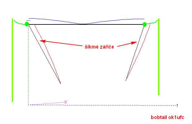 3. Praktické provední antén ok1ufc. Mám bobtail-curtain velice rád. Je to jedna z mála drátovek, které fungují nízko při zemi. V dobách, kdy jsem si mohl dovolit pro DXování jen směrovku od 20m do 10m, jsem často neměl na pásmo 30 m vůbec nic, než G5RV. A tak mi bobtail - curtain pomohla. Realizoval jsem ji účelově pro daný směr a dělal jsem ji takto:
