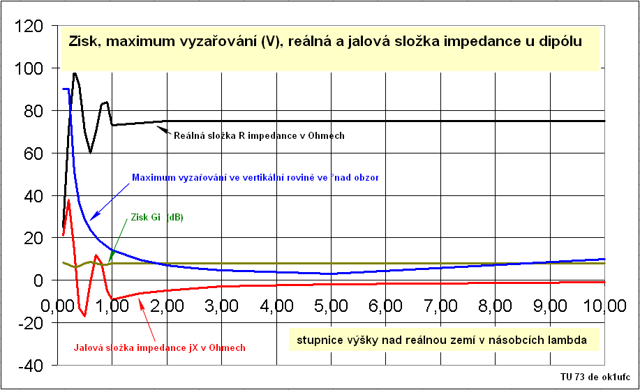 Všimněte si, že výpočet mi ukazuje hodnotu zisku o jednu setinu dB vyšší než v předchozím případě. Elevace se shoduje na desetinném místě. A já si zjednodušil život. Možná moje anténa nekmitá na hodnotě jX = 0 teoreticky nejlépe, pokud budu za rezonanci považovat maximum proudu v zářiči, ale já to nejsem schopen zjistit. Považuji tedy za rezonanci takovou délku antény při které je jX = 0, přestože se tato hodnota liší od teorie, ovšem s vědomím, že taková anténa vyzařuje prakticky stejně. A to je důvod, proč jsem si to ve svých článcích, které popisují některé Hertzovy antény, dovolil. V elektrotechnice lze ještě odvodit, že rezonance u paralelního obvodu se projeví nárůstem napětí na takovém obvodu a je na takovém kmitočtu, kde je nárůst největší. U sériového obvodu se rezonance projeví nárůstem proudu v takovém obvodu a jeho hodnota je při rezonanci největší. A platí, že v rezonanci se rovnají reaktance XL = XC. Poznámka: V programech pro NEC (MININEC) nelze snadno provést automatickou optimalizaci tak, že byste si nastavili jako kritérium "dobrého" kmitání např. velikost zisku. Pochopitelně, že by vám u takové antény vyšlo, že např. o 20% delší dipólová anténa bude mít větší hodnotu zisku než dipól v rezonanci. Přemýšlejte, proč to tak je a také kdy (u jaké antény) je vám při optimalizaci kritérium zisku k něčemu. Bohužel, zem je na krátkých vlnách téměř všude ... Ukázal jsem, že lze za rezonanci půlvlnného dipólu považovat stav, kdy hodnota jX=0 Ohmů. Jak je tato veličina závislá na výšce antény nad zemí? Tabulku pro graf jsem vypočítal v programu mmana: