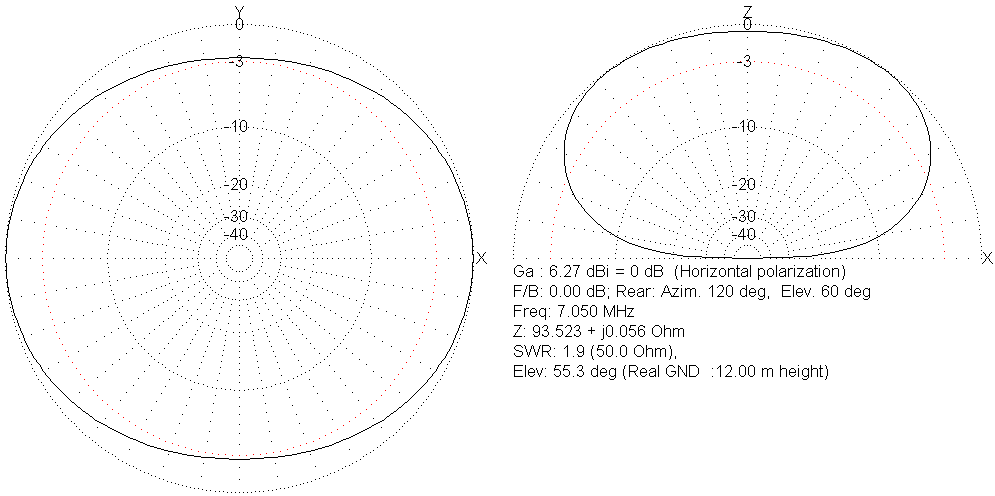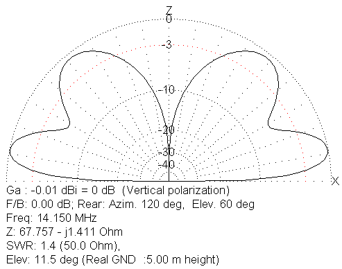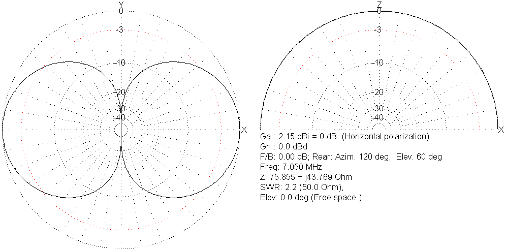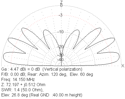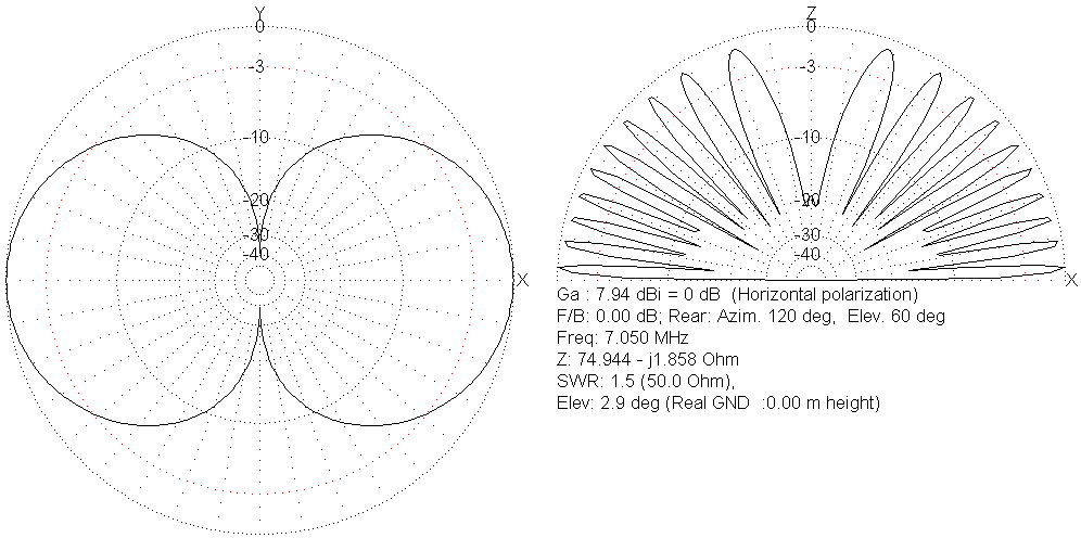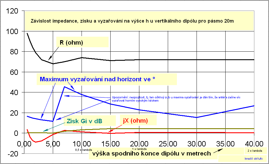 Takový nebo podobný graf byl mnohokrát publikován na internetu i v literatuře. Černá čára reprezentuje reálnou složku impedance. Vidíme, že je hodně závislá na výšce antény nad zemí a těžce nám klesá u nízko instalovaných antén. Červená čára nám ukazuje velikou závislost jalové složky jX opět na výšce. Mnohem méně se s výškou mění zisk antény Gi (dB). Když jsem tento graf prvně prezentoval mezi začínajícími hamy, okamžitě namítli, že vysoko položená anténa přeci funguje mnohem lépe, že tedy musí mít větší zisk. Vyvedl jsem je z omylu. Upozornil jsem je na skutečnost, že pokud se chtějí věnovat DX činnosti, využívat k tomu ionosférických odrazů, najdou si vysvětlení v tom, kde má anténa maximum vyzařování ve vertikální rovině. A o tom je modrá čára grafu, která klesá od hodnoty 90°, kdy anténa maximálně vyzařuje do nebe. Horizontální dipól docílí hodnoty maxima na 20° až při výšce asi 0,7 x lambda. Uvažoval jsem dipól pro pásmo 40 metrů, musel by být instalován na věžích vysokých asi 30 metrů. V grafu je vidět, že se modrá čára začíná ve výškách nad 5 x lambda zvedat. Nezajímal jsem se o vyzařování v tak vysokých výškách nad zemí, ale dovolím si upozornit na další skutečnost. Rozsekaný diagram S výškou montáže nad zemí nám bude sice klesat maximum vyzařování k horizontu, ale bude ve vysokých výškách provázené množstvím laloků s nepříjemnými minimy: