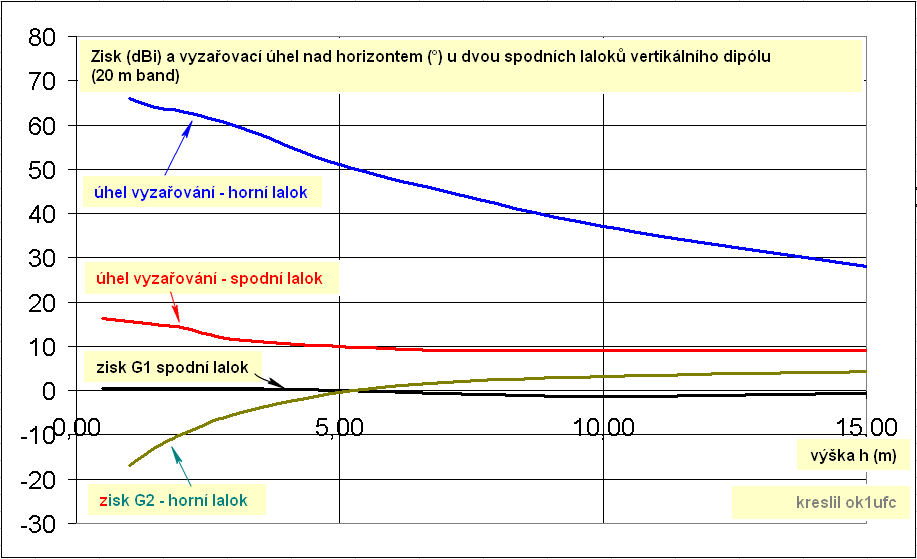 Všimněte si první odlišnosti u reálné složky impedance R. S výškou se mění méně, než u horizontálního dipólu a u nezkracovaných dipólů nám až tak neklesá pod 70 Ohmů. Rovněž jX se mění s výškou mnohem méně. Zisk Gi nám nepatrně roste od přibližně G = 0 dBi. Bohužel, hodnoty kolem 3 dB a vyšší už nejsou v praxi moc použitelné, protože maximum vyzařování se přesouvá ve vyšších výškách do horních laloků. Pokud bych v diagramu zobrazoval zisk daný spodním lalokem, jeho hodnota by klesala. Skutečnost je si třeba uvědomit a pochopit, kde se vzal ten ošklivý zub, který na té funkci vlastně není. Úhly a zisk dvou spodních laloků, aby vysvětlení bylo názornější je také vidět z tohoto diagramu: