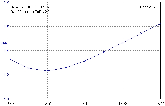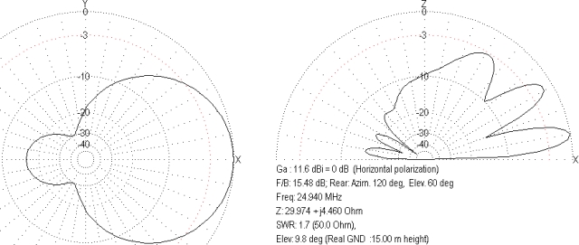 obrázek nahoře, MOXON 12 m je půl metru nad a bylo provedeno nastavení SWR, opět se "zadařilo" se nastavit SWR=1.1, a anténa vyzařuje jako nedobře nastavený dipól, ale je lépe přizpůsobená, SWR není 1.3 :-) Všimněte si, že SWR, které se podařilo nastavit je lepší, než předpokládaných SWR=1.5. Ale o to horší jsou vyzařovací diagramy horní antény pro 12 metrů. Vidíte, že tato anténa vyzařuje stejně, jako rotační dipól a ještě nám ovlivňuje anténu spodní. Nic s tím nenaděláme, museli bychom udělat úplně jiný návrh, ale to už by nebyl MOXON. Pro úplnost uvedu ještě diagramy spodní antény pro 17 metrů.
