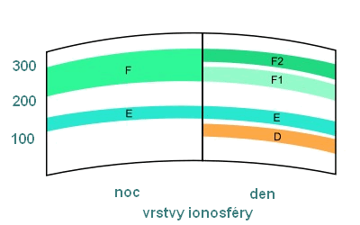 - vím o ionosférických sondách, ionogramech i o zjednodušených schématech ionosférických vrstev, které bych snad raději namaloval zjednodušeně takto: