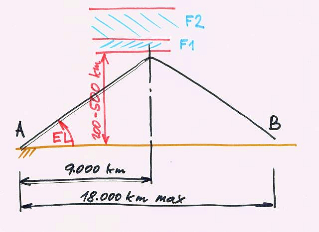 - vím tedy něco málo o tom, jak se mění vrstvy s příchodem dne (noci), se sluneční aktivitou, atd. Proč o tom píšu? Kdybych o tom nepsal, musel bych následující původní úvahu smazat jako nerelevantní, protože jsem si v ní rozvinul pozemskou dráhu do roviny, stejně tak, jako ionosférické vrstvy nad povrchem Země. To kvůli tomu, abych si alespoň pro první odhad dalších úvah nějak jednoduše stanovil, kde může být minimální hodnota elevačního úhlu, pod kterou nemá smysl jít. Nešlo o nic více, o nic méně.