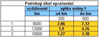 A když si vypočtu, pod jak nízkým úhlem by mi měla nejlépe vyzařovat anténa, pokud chci dělat DX spojení jen na jeden skok, vyjdou mi tyto hodnoty (ve stupních a desetinách stupně ve žlutých polích tabulky):
