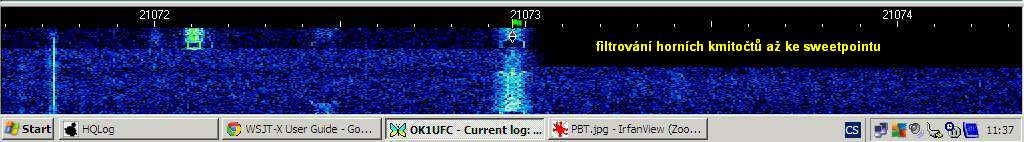pásma 250 Hz. Uprostřed filtru je vidět opět čáru slabé stanice, kterou