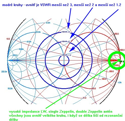 Do Smithova diagramu si rovněž z menu programu namalujeme alespoň 3 kružnice (modré). Uvnitř kruhů leží body, ve kterých je poměr stojatých vln (VSWR) lepší než 1.2 (nejmenší kruh), lepší než 2 (střední kruh) a lepší než 3 (největší kruh).