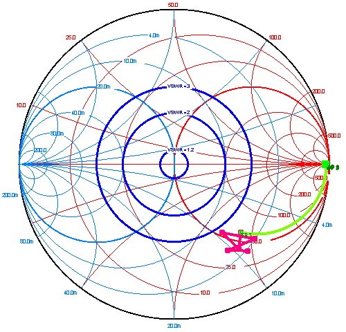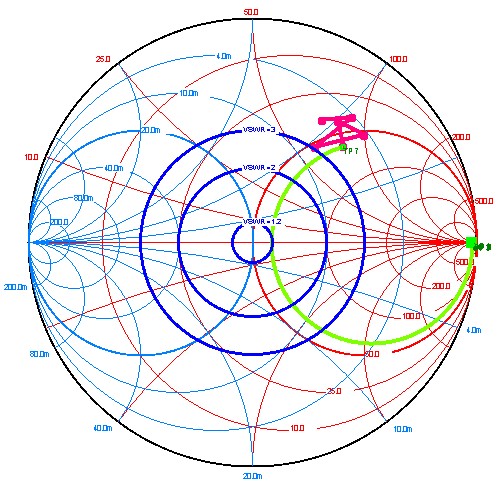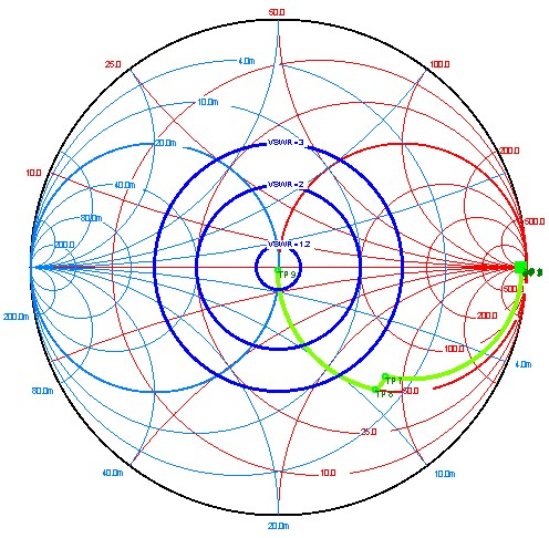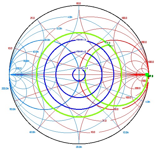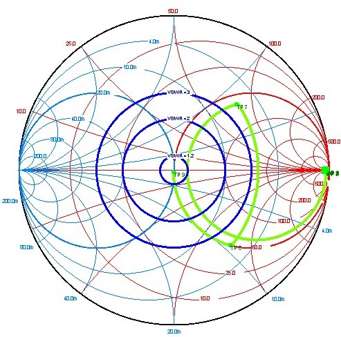 Koaxiál (o char. impedanci Z=50 Ohmů) nám samozřejmě bude transformovat impedance. Změnou délky koaxiálu však nikdy nedocílíme správného přizpůsobení, protože to teoreticky není možné. Je však pravdou, že při některých délkách koaxiálu vyladíme anténu s tunerem snadno a při jiných to může být obtížné. Ve Smithově diagramu - viz obrázek vpravo, si všimněte téměř celé zelené kružnice. Ta představuje koaxiální kabely o délkách od nuly (bod TP7) do 41.5 metru elektrické délky (TP8, 41.5m je téměř 1/2 vln. délky). Uvědomte si, že VSWR je pořád vysoké (vyšší než 3 - mimo modré kruhy), ale impedance se pohybují v různých hodnotách.