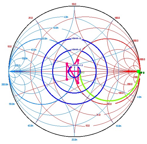 Našemu zářiči s impedancí DP1 by vyhovovala pro nejlepší VSWR elektrická délka žebříčku LL= 21.1 metru,  VSWR bude cca 1.2 a impedance v místě napájení bude Z = 59 Ohmů na f = 3.550 kHz. Pokud bude impedance zářiče jiná (např. odpovídající DP2 až DP6), budou se impedance v bodě napájení pohybovat mezi fialovými body kolem středu diagramu (body jsou pospojované tlustou lomenou čárou). Toto řešíme v programu tak, že z menu Extras zapneme funkci Sweep a zvolíme volbu Sweep over datapoins. Program nám výsledné impedance vykreslí bezprostředně a jednoduchým pohledem vidíme, jak na tom jsme.
