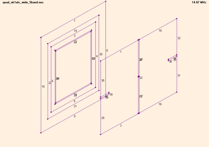 Tento článek jsem více méně napsal z hecu. Chtěl jsem ukázat na složitější, ale zase nikoliv až tak složité anténě, jak se její model liší od naměřených výsledků. Abych srovnání ukázal názorně, vybral jsem si dvouelementový pětipásmový quad, který je modifikovaný z quadu DK7ZB. Quad byl měřen ve dnech od 5.7.2013 do 8.7.2013 s jedním ze zářičů, s jehož použitím se uvažuje v letošní letní limitované výrobní sérii. Geometrický model quadu byl nakreslen v autocadu s mým modulem, kterému říkám airwire cad. Toto řešení má pro mě výhodu v tom, že v "nějakém normálním" CADu si člověk osvojí jeho možnosti, výhody, zavede si zvyklosti a udělá si celou řadu různých utilitek, které potřebuje k práci. Nicméně, pro publikační účely pro radioamatérskou praxi se hodí, aby data byla mnohem jednodušší, než jsou data v precizním modelu a aby to byla data, která "vypadnou" např. z editoru freewarového programu, který je zadarmo, jako např. 4NEC2. Proto právě o tomto jsem napsal pár vět na konci článku. Nyní se vrátím k vlastnímu srovnávání.