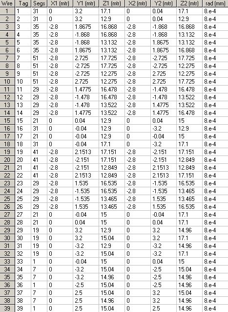 Jak jste si mohli všimnout, jsou tam jednotlivé symboly, tagy, definice všech 39 anténních drátů, najdete tam jeden zdroj, nastavení frekvence na 14070 kHz a další detaily. Takový soubor lze "nasosat" programem 4NEC2 a v geometrickém editoru se vám po jeho importu objeví např. tato tabulka s dráty: